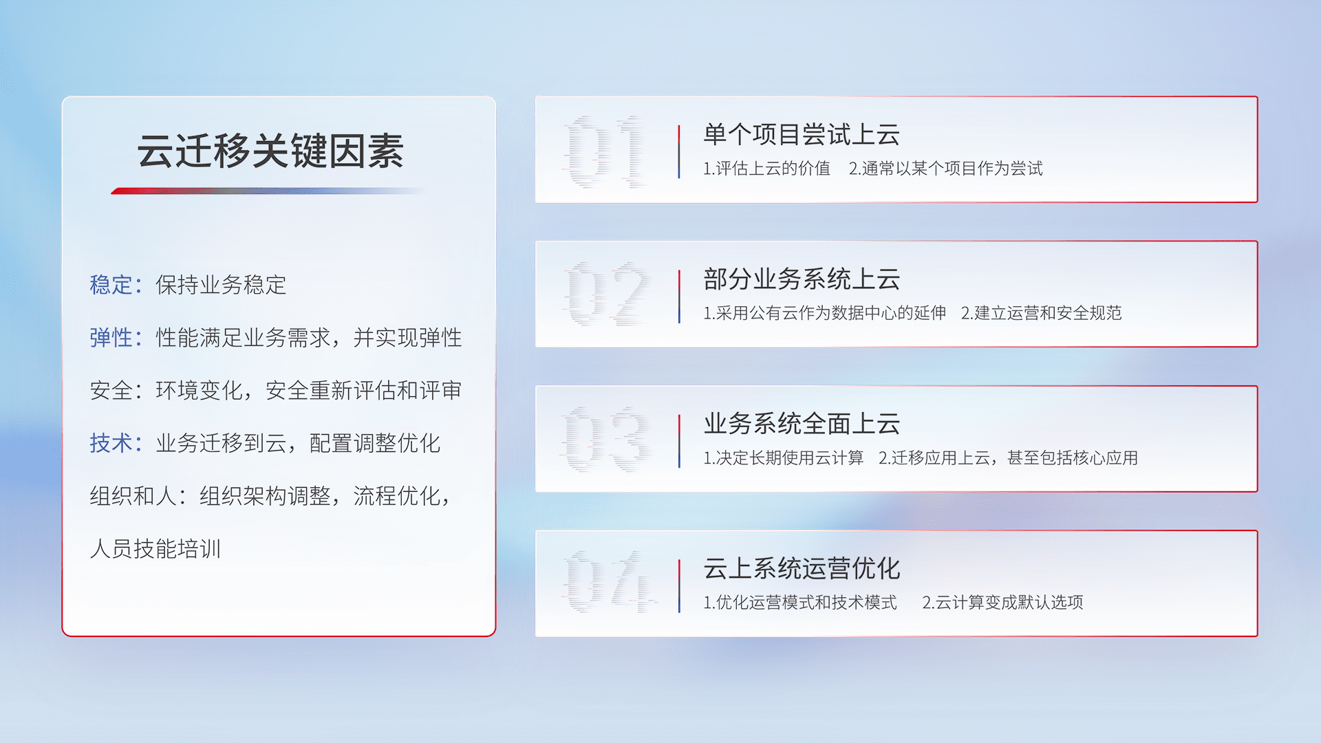 结合实际业务,,,从规划设计、、云平台选型、、云原生改造、、、、数据迁移、、、、集成交付,,,迁移全过程为客户识别最佳上云路径,,,做好风险识别管理,,,,设计网络架构、、、身份权限、、、安全审计合规、、、操作审计、、、日志审计、、监控告警策略、、、多站点容灾设计等,,,对云上基础设施进行整体规划,,提升IT治理水平,,,,以满足弹性、、、、高可用、、高性能的需求。。