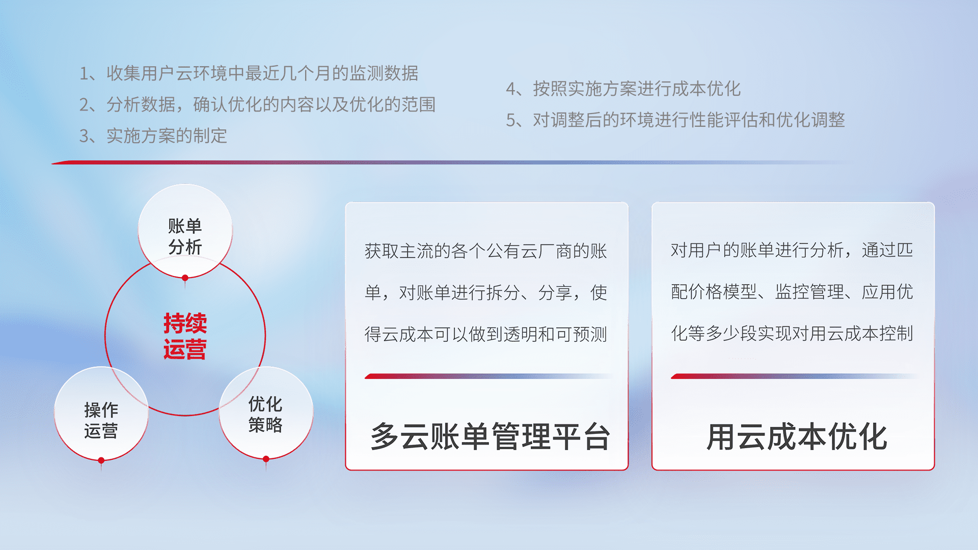通过多云纳管,,以统一的资源数据模型把客户的云资源进行抽象和封装,,,,进而实现对多云资源的统一操作,,保障云资源管理的可靠性、、、稳定性与可用性。。。量身定制化运维内容,,配置、、开发运维、、补丁管理、、备份、、、监控、、、、认证和访问管理、、审计和日常巡检等,,,保障在用云过程中的可靠度,,,,稳定度以及高可用率。。。